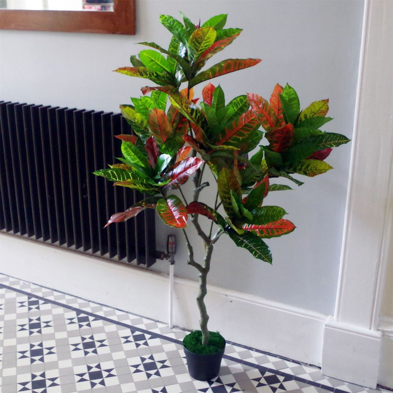 130cm Artificial Tree Codiaeum Variegatum, a stunning plant native to Australia and Indonesia. With its variegated leaves, it is no wonder why this plant is a popular choice for indoor decoration. Unlike the real Codiaeum Variegatum, which is both poisonous and difficult to maintain, our artificial version offers a safe and low-maintenance alternative. Standing at 130cm high x 60cm x 60cm, this plant is incredibly realistic and comes with wired stems that can be adjusted to your liking. It comes potted in a plastic pot, ready to be displayed in your home. For an added touch of luxury, consider placing it in one of our metal planters (sold separately).